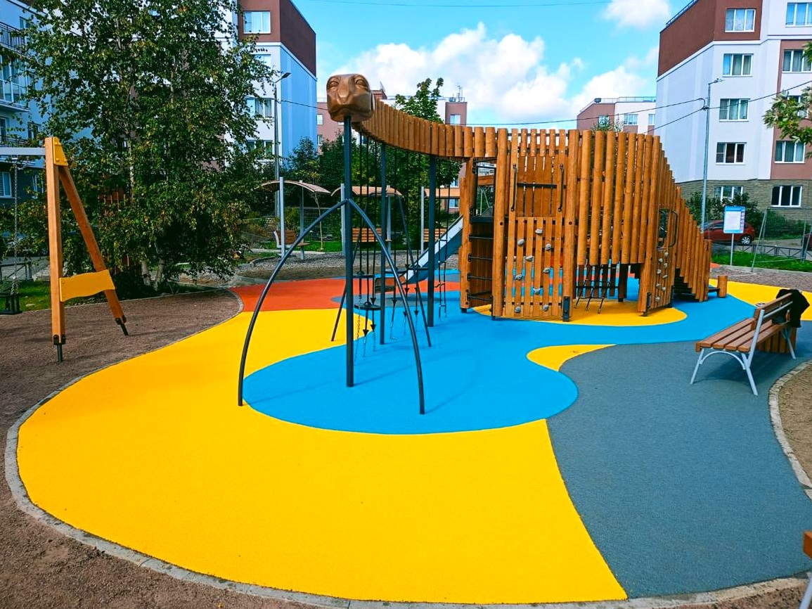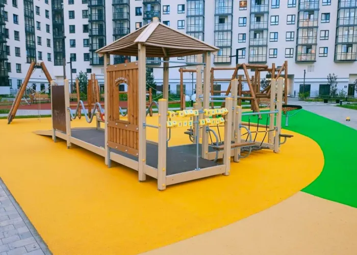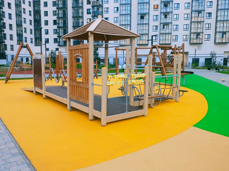 Верхний слой: цветная каучуковая крошка EPDM (толщина 10 мм).