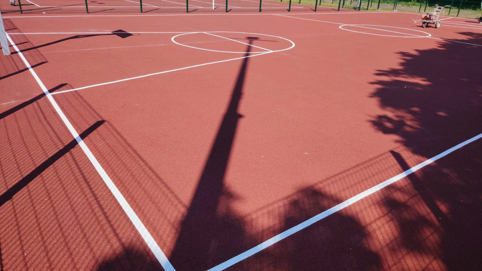 Устройство покрытия универсальной спортплощадки для игры в волейбол, баскетбол, мини-футбол. Используемый материал — бесшовное покрытие «Мастерфайбр Спорт».