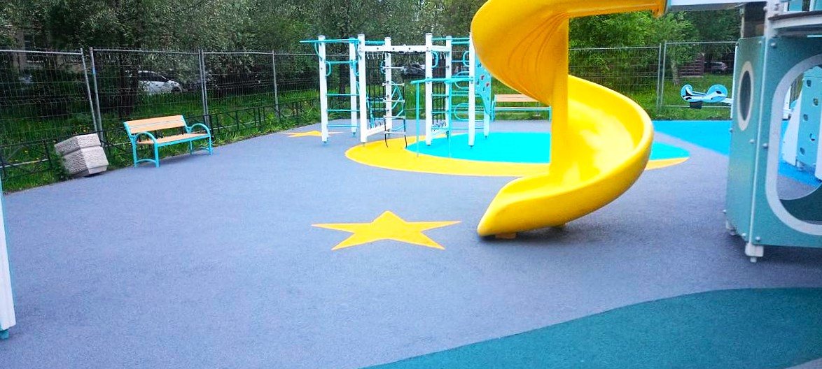 Нанесение верхнего слоя, состоящего из окрашенной резиновой и каучуковой крошки в соответствии с рисунками в дизайн-проекте.
