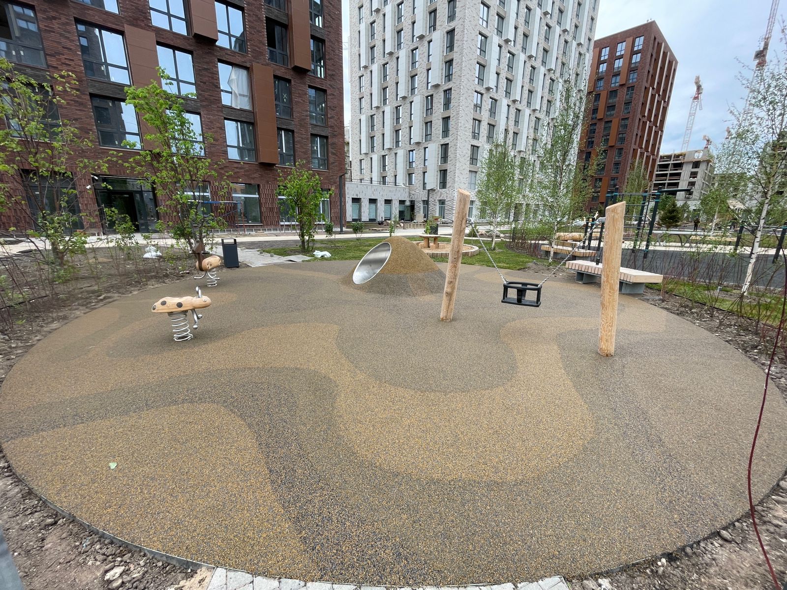 Устройство покрытия на детской площадке для детей младшего возраста, монтаж ландшафтного оборудования с покрытием из резиновой крошки.